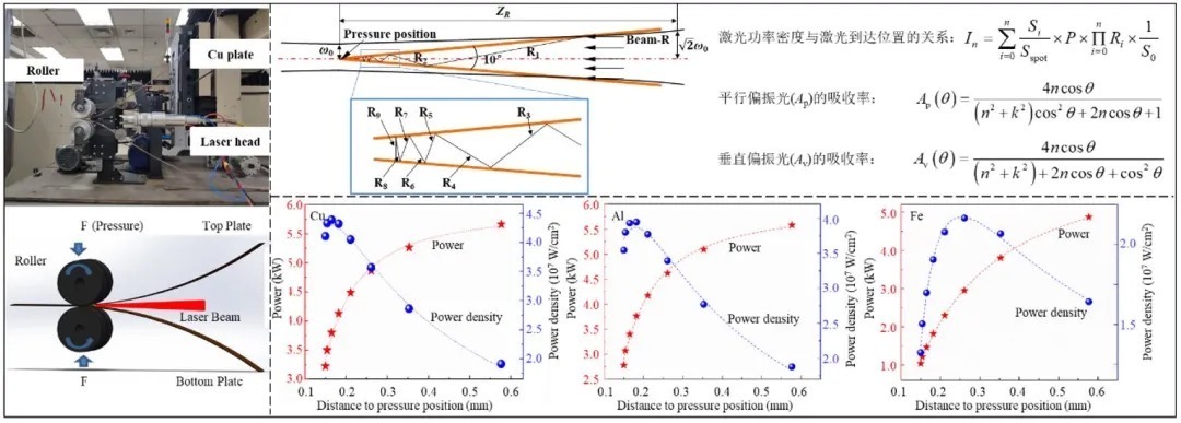 针对近红外激光焊接高反射率铝、铜等金属材料过程中,激光能量利用率低、焊接效率低等问题,搭建了激光压力焊接试验平台,建立了激光压力焊接能量传输模型,揭示了V型坡口内激光功率密度变化规律。结果表明,高反材料铝或铜组成的V型坡口对光纤激光能量汇聚作用显著,是原始光斑能量密度的数倍,实现材料的熔化(图1)。